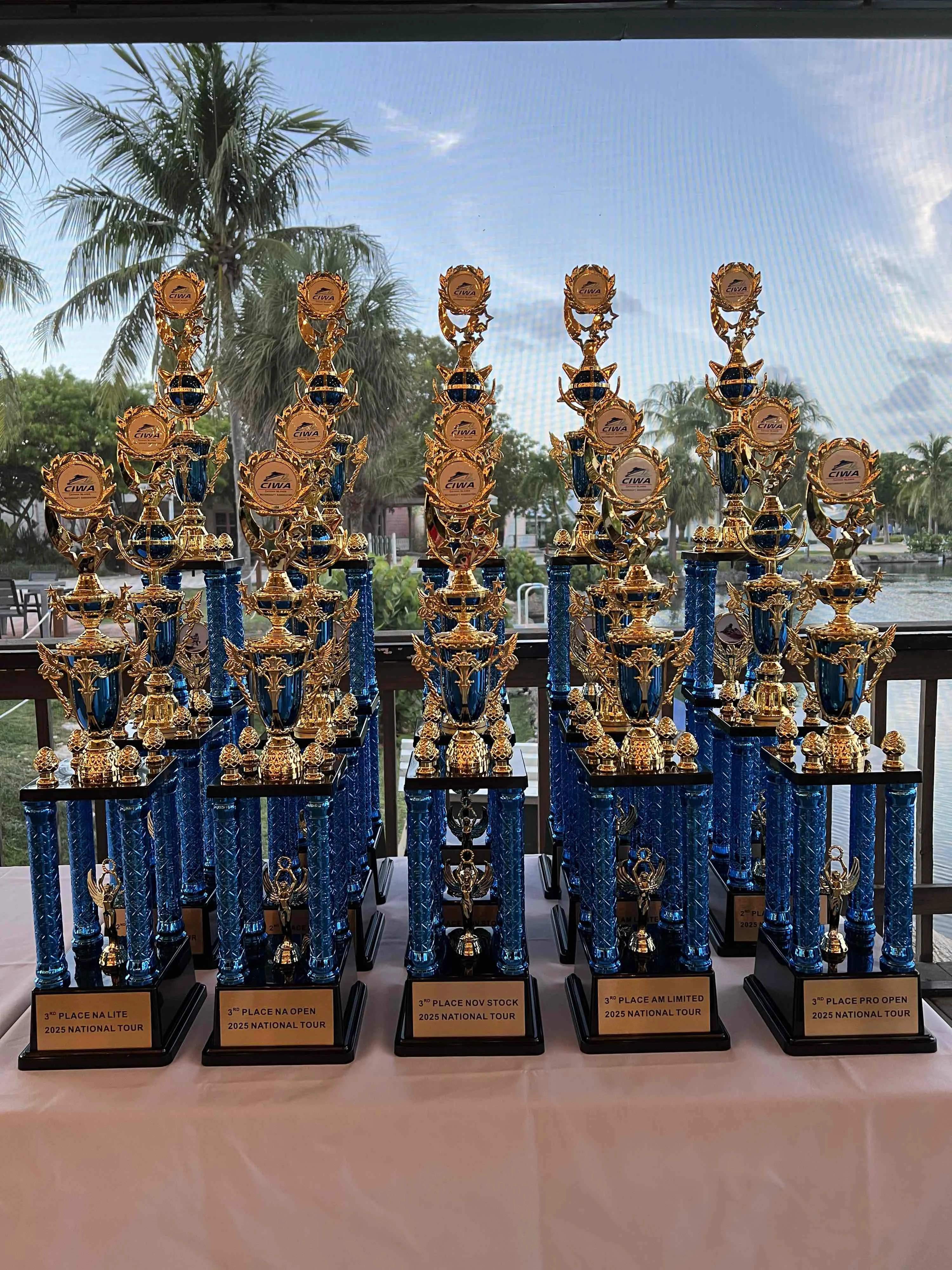 两个奖杯的顶部都有一个金色的溜冰鞋。# trophy # 塑料奖杯